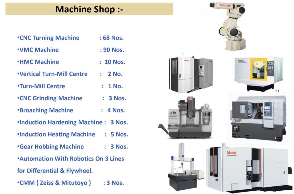 In this unit we have 68 CNC Turning Machines, 90 VMC Machines, 10 HMC Machines, 2 Vertical Turn-Mill Centre, 1 Turn-Mill Centre, 3 CNC Grinding Machines,